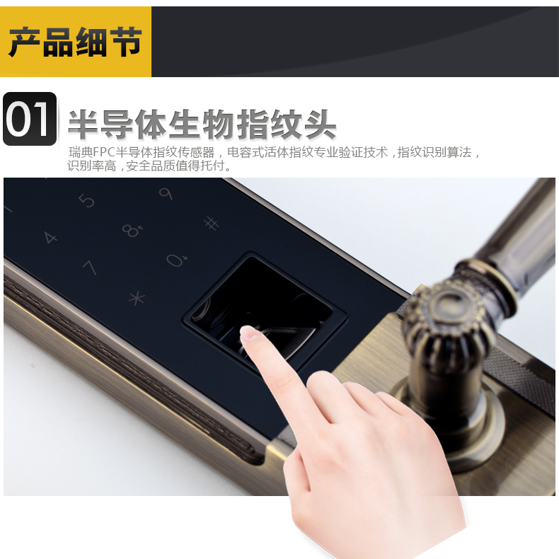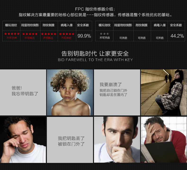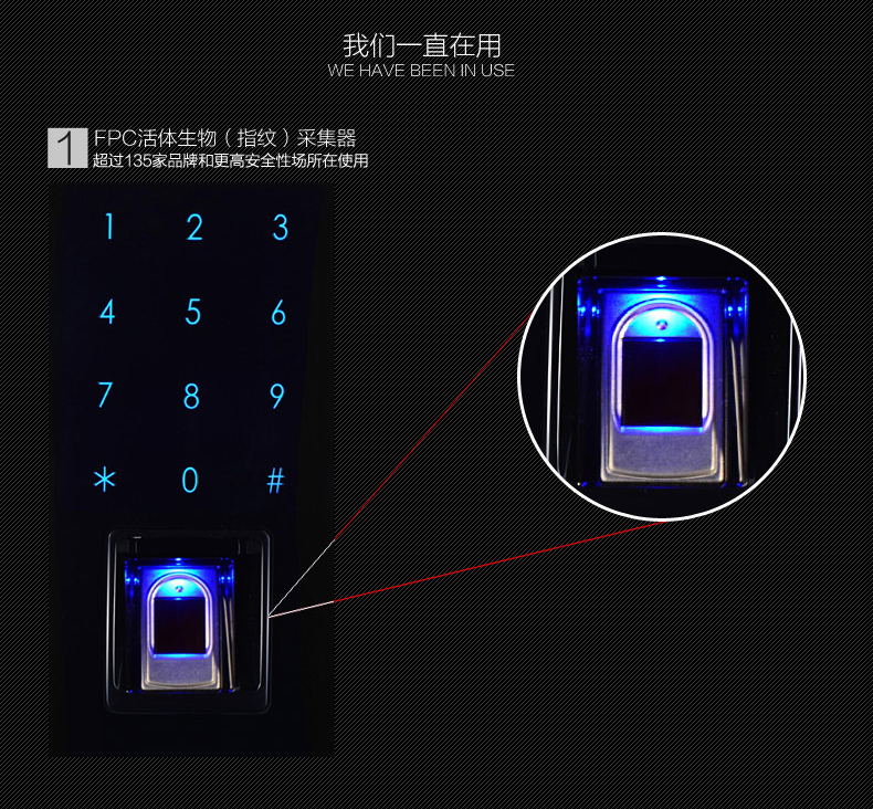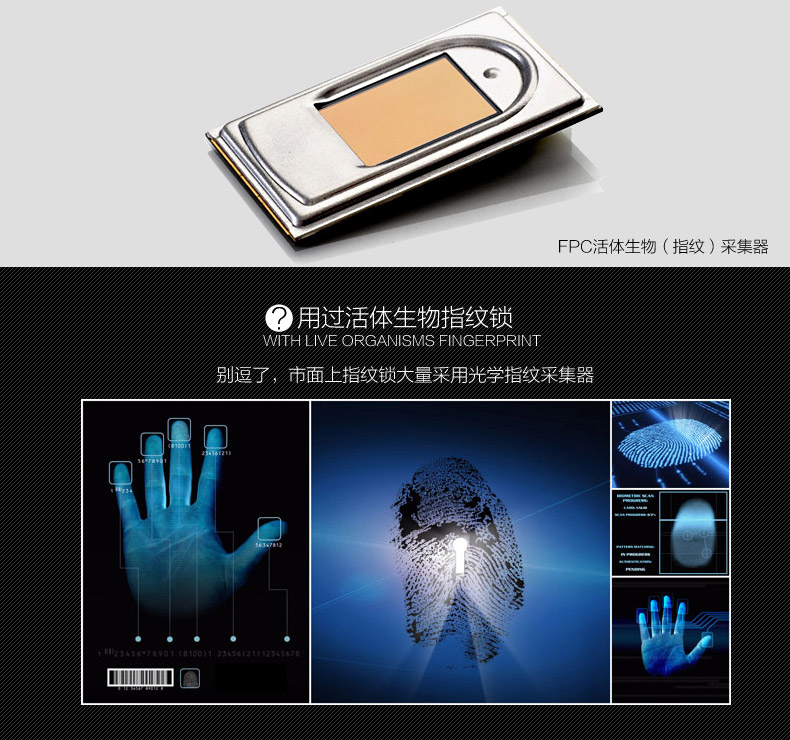• 指纹传感器:采用瑞典FPC公司半导体指纹传感器,全球135家品牌银行专用传感器,并采用活体生物(指纹)识别算法技术,杜绝假指纹开启;