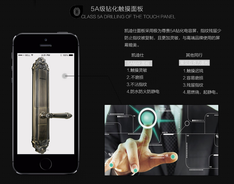 • 钻化触屏:采用5A级高强度钻化电容式触摸感应屏,和iPhone手机采用同样的触屏技术;