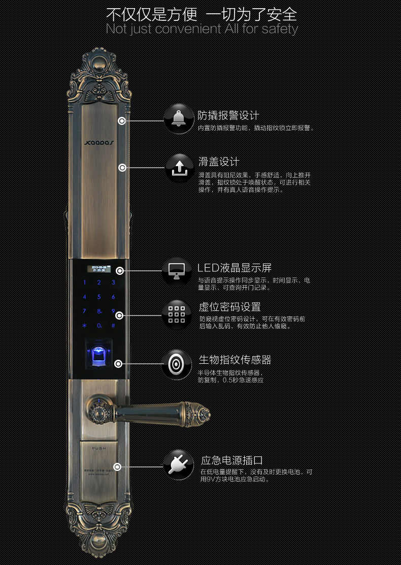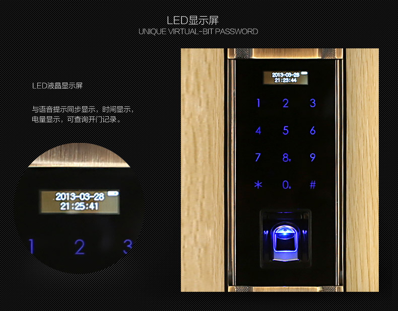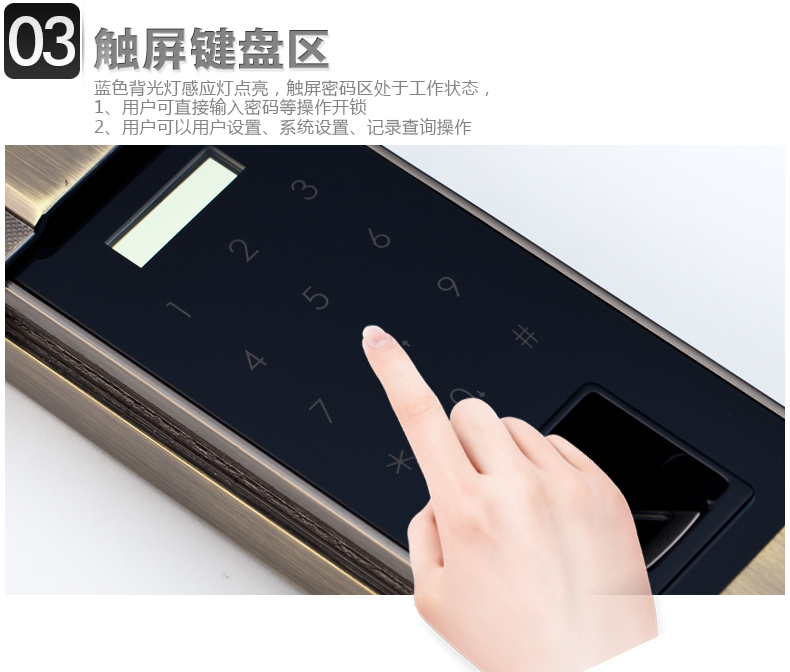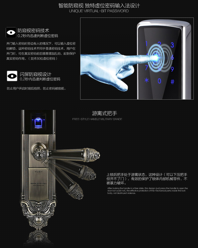 • 防窥视功能:防范式虚位密码输入法,防止密码被恶意偷窥窃取,安全无忧;