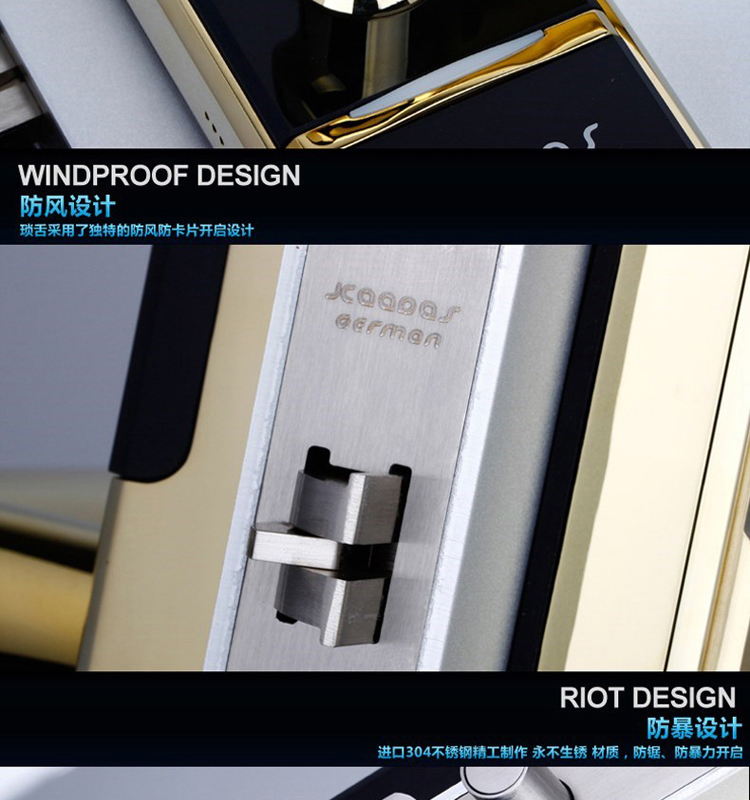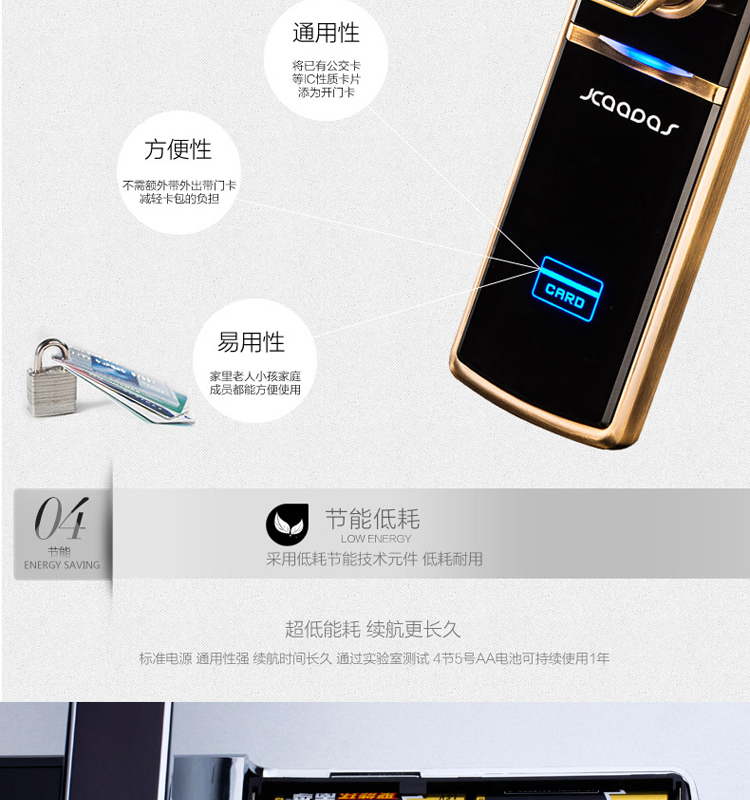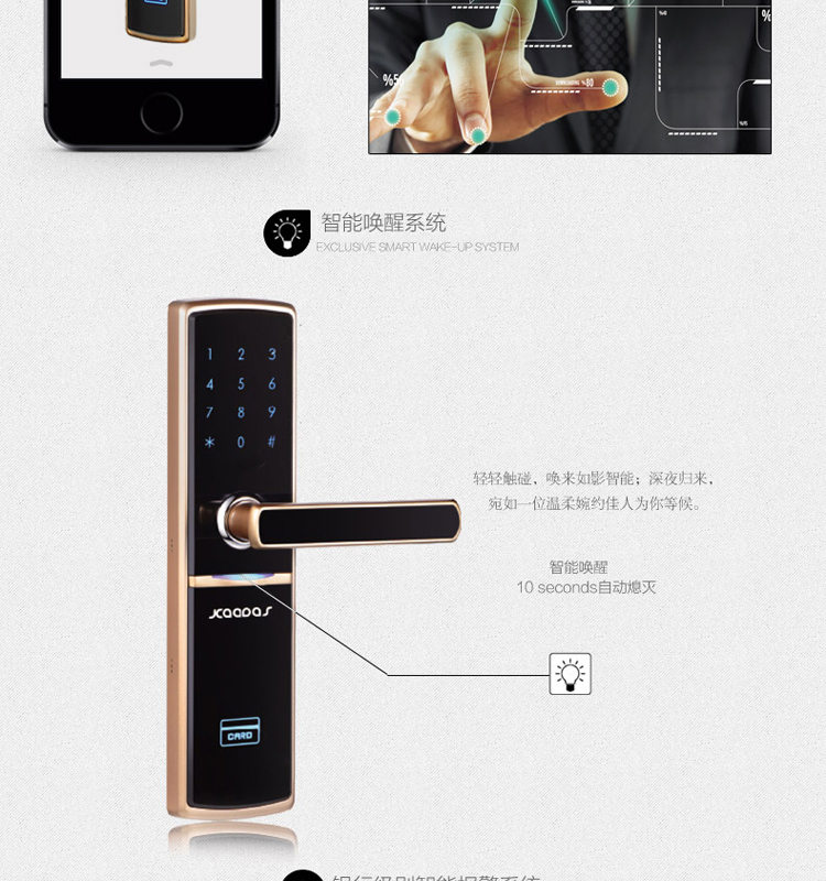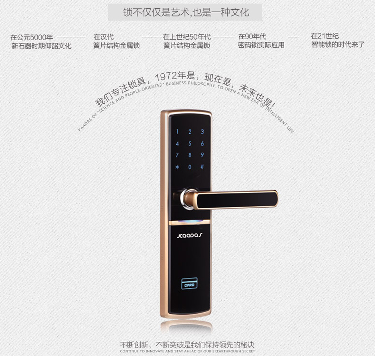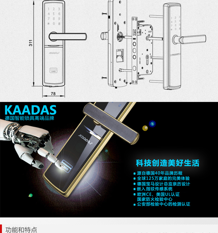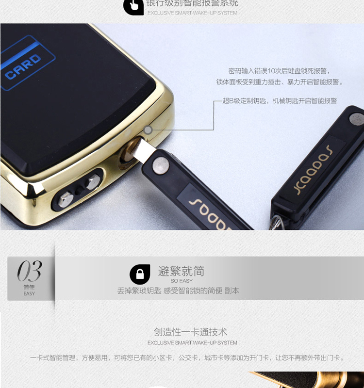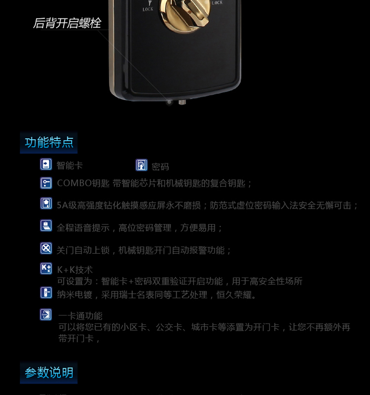 • 开锁功能:卡片/密码/钥匙开启