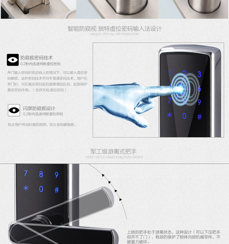 • 防窥视功能:防范式虚位密码输入法,防止密码被恶意偷窥窃取,安全无忧;