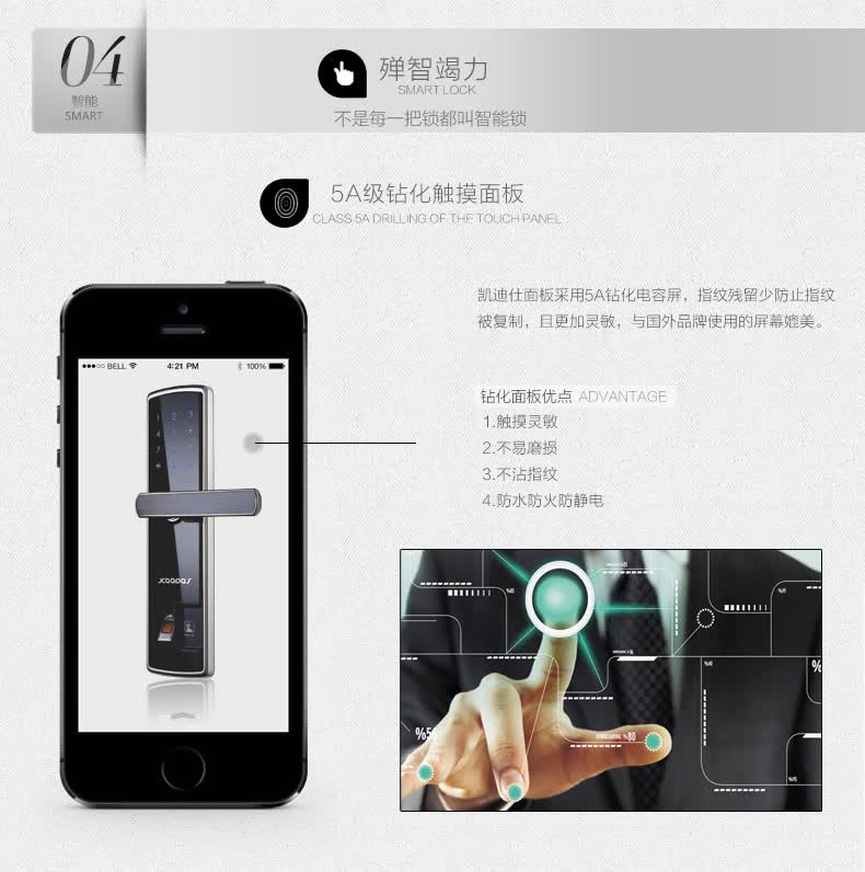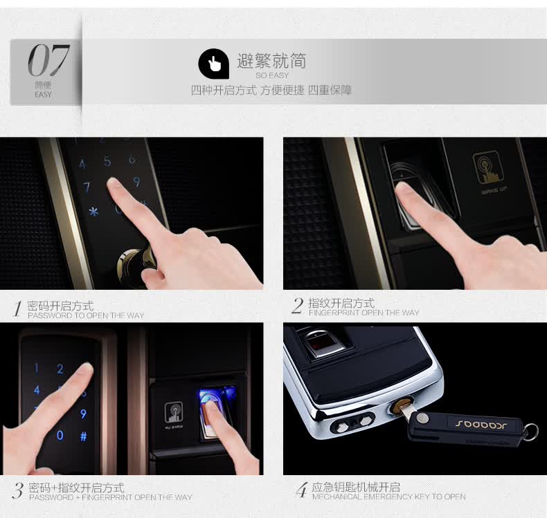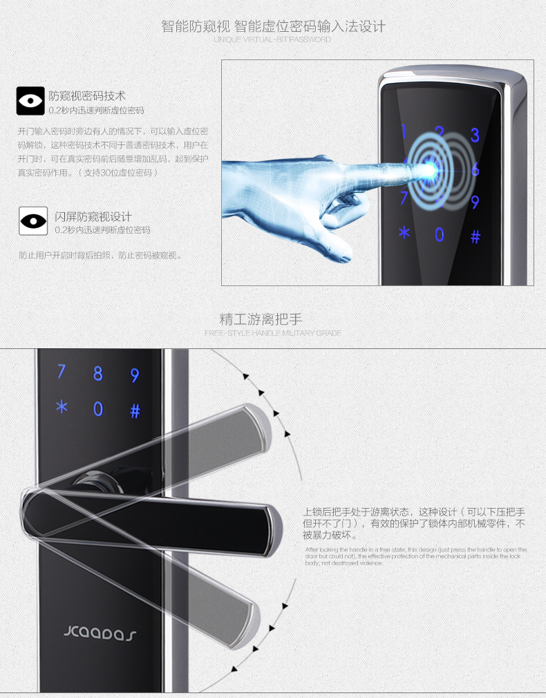 • 防窥视功能:防范式虚位密码输入法,防止密码被恶意偷窥窃取,安全无忧;