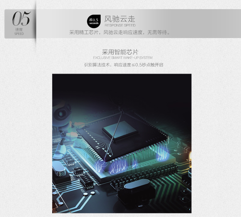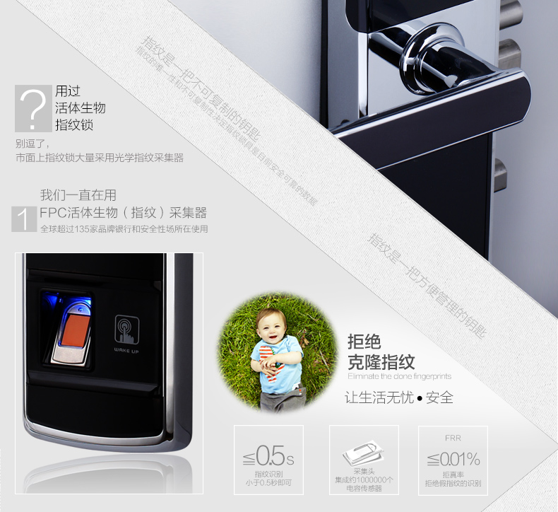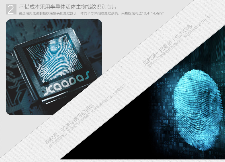 • 指纹传感器:采用瑞典FPC公司半导体指纹传感器,全球135家品牌银行专用传感器,并采用活体生物(指纹)识别算法技术,杜绝假指纹开启;